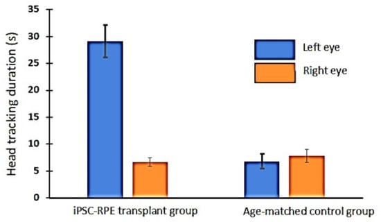 OKN testing data based on the duration of head-tracking recorded from 4-month-old immunodeficient RCS rats (±SE). The data show improved head-tracking response in the iPSC-RPE transplanted left eyes (n = 12) compared to the non-transplanted eyes and age-matched control rats (n = 5).