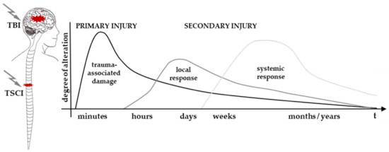 The neurotraumatic injuries TSCI and TBI are caused by an external physical insult which results in a force-dependent temporary to permanent functional alteration. The highly complex pathophysiology of both TSCI and TBI is divided into primary injuries, induced by the initial energy transfer and deformation, and secondary injuries, referring to the subsequent biochemical and cellular cascade at the local and systemic levels in response to the primary event; these injuries can range from acute to chronic (Figure 1) [1,24,25].