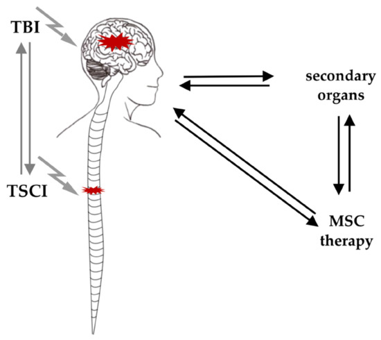 In summary, the negative effects of TSCI on cognitive function in patients suffering from TBI as well as the impact of TBI on the sensorimotor outcome in patients with TSCI suggest a bidirectional interaction of both traumatic injuries. This interaction might occur directly or indirectly via secondary organs (Figure 2). This is further supported by the clinical observation of enhanced bone formation following TSCI and TBI, which employ local regenerative mechanisms involving MSCs [81,82] and underline the impact on MSC-mediated healing cascades. Furthermore, concomitant injuries, diseases and complications can influence the course of healing [83]. However, the current understanding of TSCI-TBI crosstalk and its effect on MSC treatment remains limited [84].