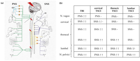 Differential effects of TSCI and TBI on the autonomic nervous system (ANS) depending on the trauma level. (a) The parasympathetic innervation of thoracic and upper abdominal organs originates from the cranial nerve N. vagus, while the innervation of the lower abdominal and pelvic organs (Cannon’s point) originates from the spinal cord segments S2-S4 (Nn. splanchnici pelvicii). The sympathetic innervation via the sympathetic trunk originates from the spinal cord segments T1-L3. (b) While TBI results in general dysregulation (↑↑) of PNS and SNS, TSCI commonly spares the N. vagus (except for high cervical trauma), while its effects on the SNS are dependent on the localisation of trauma. Graphics adapted from [4,85]. Abbreviations: N. = Nervous, PNS = parasympathetic nervous system, SNS = sympathetic nervous system, TBI = traumatic brain injury, TSCI = traumatic spinal cord injury.