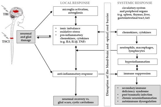 Proposed local and systemic immune response following injury to the central nervous system: TSCI and TBI. The initial primary injury causes neuronal and glial as well as meningeal and vascular damage, which activates the local innate immunity. In response, the level of pro- and anti-inflammatory molecules increases, which triggers peripheral immune cells to access the injury site through the disrupted blood–brain and blood–spinal cord barriers, resulting in a systemic immune response. While the balance of pro- and anti-inflammatory mediators induces repair processes aiming for neuronal recovery, potentially leaving glial scars and cystic cavitations, a dysfunctional response can result in systemic hyperinflammation with damage to peripheral organs and sepsis, chronic neuroinflammation, and autoimmunity, as well as systemic immune suppression and secondary immune deficiency syndrome. Graphic inspired by [123]. Abbreviations: IL = interleukin, TBI = traumatic brain injury, TNF = tumour necrosis factor, TSCI = traumatic spinal cord injury.
