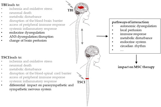 TSCI and TBI are proposed to interact in a bidirectional manner, suggested by the negative effect of TSCI on cognitive function in patients suffering from TBI, the impact of TBI on sensorimotor outcome in patients with TSCI, and the clinical observation of enhanced ossification following TSCI and TBI, underlining the impact on MSC mediated healing cascades. Therefore, TSCI-TBI interactions on the local and systemic levels still have to be characterised and considered upon the application of MSC therapy. These environmental changes are caused by the alterations of the autonomic and peripheral nervous system, the inflammatory response, local perfusion, endocrine homeostasis and circadian rhythm (Figure 5), potentially causing crucial effects on MSC biology.