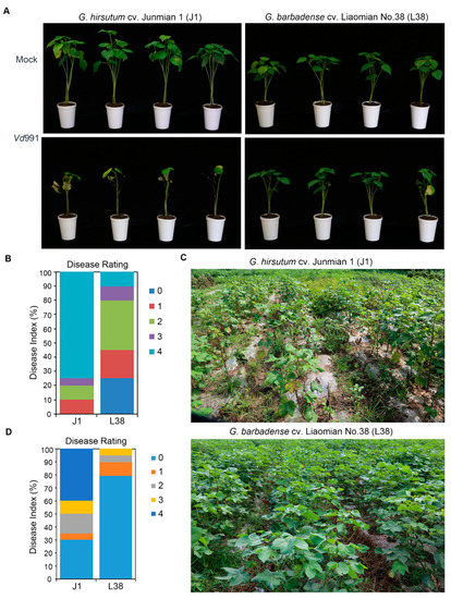 Phenotype of Gossypium hirsutum cv. Junmian No.1 (J1) and cv. Liaomian No. 38 (L38) cotton defense against Verticillium dahliae. (A) Disease symptoms of J1 and L38 cotton following inoculation with V. dahliae strain Vd991 and treatment with water as mock/control. The severity of cotton wilting as shown in the corresponding pictures recorded at 14 days post inoculation (dpi). (B) Disease index of J1 and L38 cotton were determined at 14 dpi after Vd991 inoculation. Disease grade 0, 1, 2, 3, and 4 showed the disease range from asymptomatic to lethal. (C) Disease symptoms of J1 and L38 cotton planted in disease nursery of Liaoyang city at July 2021. (D) Disease index of J1 and L38 cotton planted at the Liaoyang disease nursery was determined during July 2021. Disease grades 0, 1, 2, 3, and 4 encapsulate the disease from asymptomatic to lethal.