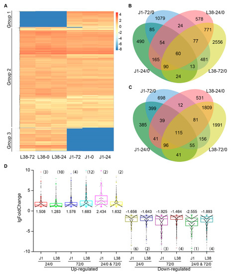 Analysis of differentially expressed genes (DEGs) in J1 and L38 cotton during V. dahliae inoculation. (A) Heatmap showed the time course expression profiles of genes annotated in J1 and L38 at 0 h, 24 h, and 72 h, respectively, which was performed by FPKM values of all genes. (B) The Venn diagram of the up-regulated DEGs indicated unique and common DEGs for four different comparisons, including J1-24 h/ 0 h (J1-24/0), J1-72/0 h (J1-72/0), L38-24 h/ 0 h (L38-24/0), and L38-72 h/ 0 h (L38-72/0). (C) The Venn diagram of the down-regulated differentially expressed genes (DEGs) indicated unique and common DEGs for four different comparisons, including J1-24 h/ 0 h (J1-24/0), J1-72/0 h (J1-72/0), L38-24 h/ 0 h (L38-24/0), and L38-72 h/ 0 h (L38-72/0). (D) The fold change of up- and down-regulated DEGs in J1 and L38 at 24/0, 72/0, and both 24/0 and 72/0 (24/0 & 72/0). The numbers indicate the median of all lgfoldchange of DEGs in each group, and the number in bracket indicates the number of DEGs for which lgfoldchange was higher than 10 or lower than −10.