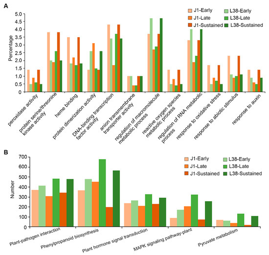 To reveal potential functions of differentially expressed genes (DEGs), we identified the Gene Ontology (GO) terms of these genes. Therefore, the DEGs were divided into six groups for further analysis, including those specifically expressed in J1-24/0 (J1-Early), specifically expressed in J1-72/0 (J1-Late), expressed both in J1-24/0, J1-72/0 (J1-Sustained), expressed only in L38-24/0 (L38-Early), expressed only in L38-72/0 (L38-Late), and expressed both in L38-24/0 and L38-72/0 (L38-Sustained). Thus, 701, 899, 1422, 3524, 390, and 2078 DEGs matching to the above-mentioned groups were assigned GO terms. The regulation of macromolecule metabolic process and regulation of RNA metabolic process were highly enriched both in cultivar J1 and L38 (Figure 3A). Each group of L38 was higher than the corresponding group in J1, and the early and sustainably expressed DEGs were notably higher than the late expressed DEGs (Figure 3A). In addition, the DNA-binding transcription factor activity was also mainly enriched (Figure 3A). The enrichment of response to auxin, response to abiotic stimulus, response to oxidative stress, protein serine/threonine activity and peroxidase activity in J1 were higher than in L38 (Figure 3A). Interestingly, DEGs of J1 and L38 were equally enriched in anion transmembrane transporter activity (Figure 3A).