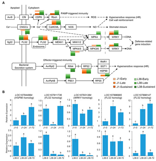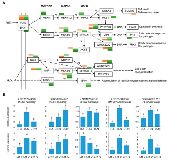 MAPK cascades are highly conserved signaling modules which play a pivotal role in signaling plant defense against pathogen attack by transducing extracellular stimuli into intracellular responses in the plant [38]. In the MAPK signal pathway, 255 DEGs were detected as regulating pathogen infection (flagellin) and pathogen attack (Table S6). Suppressor of mkk1 mkk2 2 (SUMM2), that is involved in reducing cell death defense response, was the only enriched DEG of J1 in the early stage which was different from other pathways (Figure 6A). Furthermore, the points of MEKK1, MEKK1/2, MPK4, MAP kinase substrate 1 (MKS1), and PR1 were the only enriched DEGs of L38 (Figure 6A). In particular, only DEGs of L38 were assigned to MEKK1 and MPK4 when under H2O2 attack, which influences the accumulation of ROS during plant defense response, instead of DEGs of J1 enrichment (Figure 6A). Otherwise, the specific DEGs regulated by the MAPK signal pathway were selected and the expression pattern was confirmed by RT-qPCR analysis (Figure 6B).
