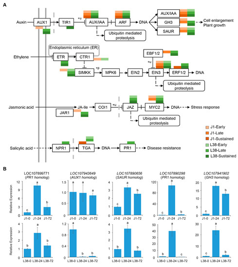 DEGs were enriched in plant hormone signal transduction. (A) Demonstration of enrichment of DEGs assigned in plant hormone signal transduction with p-value < 0.05. (B) Expression pattern analysis of specific DEGs of J1 and L38 in plant hormone signal transduction by qRT-PCR. Relative expression levels were normalized by cotton 18S expression level. The relative gene expression level in J1-0 and L38-0 were assigned a value of 1. Error bars indicate ±SD of three biological replicates, with each measured in triplicate. Samples marked with different letters show a significant difference at p < 0.05 by Duncan’s multiple range test.