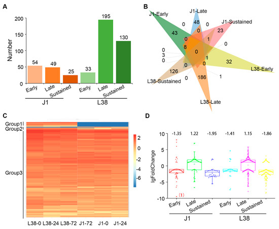 Characteristic of resistance gene analogues (RGAs) in J1 and L38 during Verticillium dahliae inoculation. (A) Number of RGAs in J1-early, J1-late, J1-sustained, L38-early, L38-late, and L38-sustained, respectively. (B) Venn diagram showed RGAs that were commonly and uniquely differentially expressed in J1-early, J1-late, J1-sustained, L38-early, L38-late, and L38-sustained, respectively. (C) Heatmap showed the time course expression profiles of RGAs annotated in J1 and L38 at 0 h, 24 h, and 72 h, respectively, which was performed by FPKM values of all genes. (D) The fold change of RGAs in J1-early, J1-late, J1-sustained, L38-early, L38-late, and L38-sustained. The number indicates the median of all log fold change of DEGs in each group, and the number in brackets indicates the number of RGAs for which log fold change was than −10.
