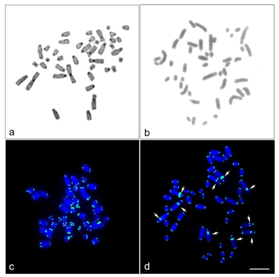 C-banded metaphase spread, and chromosomal locations of the telomeric (TTAGGG)n sequence in the common house gecko (Hemidactylus frenatus, Duméril and Bibron, 1836) [72] and the flat-tailed house gecko (Hemidactylus platyurus, Schneider, 1797) [73]. C-banded metaphase spread in HFR (a) and HPL (b). FISH patterns of the telomeric (TTAGGG)n sequence on DAPI-stained metaphase chromosome spreads of HFR (c) and HPL (d). Arrows indicate signals of interstitial telomeric sites. Scale bars represent 10 μm.