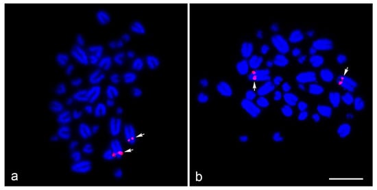 Chromosomal locations of chicken and zebra finch BACs of the flat-tailed house gecko (Hemidactylus platyurus, HPL) (Schneider, 1797) [73]. GGA23 BAC (Texas Red-labeled TGMCBA-272G9) was located on chromosome 1 (HPL1) (a) and GGA27 BAC (Texas Red-labeled CH261-28L10) was located on chromosome 4 (HPL1) (b). Arrows indicate hybridization signals. Scale bar represents 10 µm.
