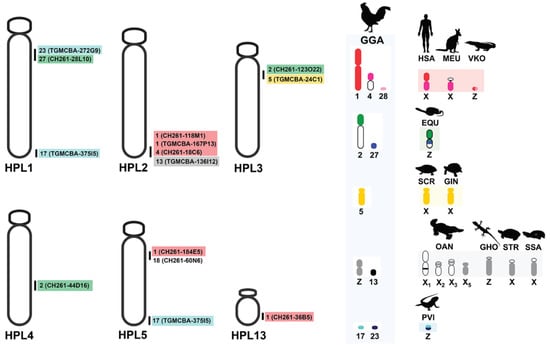 No chicken and zebra finch BACs were contractually mapped in HFR chromosomes. More than 20 metaphase spreads were observed for each BAC, with hybridization efficiencies ranging from 70% to 90%. Chromosome homology among HPL, chicken, and zebra finch was analyzed using the chicken genome database (https://www.ncbi.nlm.nih.gov/genome/annotation_euk/Gallus_gallus/104/, accessed on 1 July 2020) and the zebra finch genome database (https://www.ncbi.nlm.nih.gov/genome/annotation_euk/Taeniopygia_guttata/103/, accessed on 1 July 2020). The thirteen BACs mapped on HPL chromosomes included three BACs mapped on HPL1 that were homologous to GGA17p (TGMCBA-375I5), GGA23 (TGMCBA-272G9), and GGA27q (CH261-28L10), four BACs mapped on HPL2 that were homologous to GGA1q (CH261-118M1), GGA1 (TGMCBA-167P13), GGA4 (CH261-18C6) and GGA13 (TGMCBA-136I12) and two BACs mapped on HPL3 that were localized to GGA2p (CH261-123O22) and GGA5 (TGMCBA-24C1). One BAC mapped on HPL4 was localized to GGA2q (CH261-44D16), three BACs mapped on HPL5 were homologous to GGA1q (CH261-184E5), GGA17p (TGMCBA-375I5) and GGA18p (CH261-60N6), and one BAC mapped on HPL13 was located on GGA1 (CH261-36B5) (Figure 3, Figure 4 and Table 2).