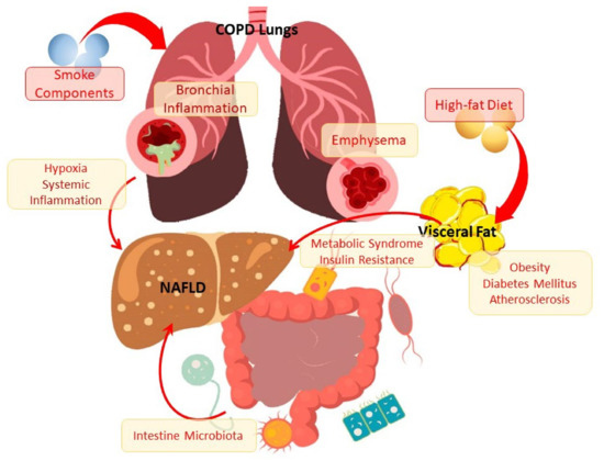 To date, the concept of systemic inflammation in COPD is actively studied and discussed. Among the possible mechanisms of systemic inflammatory response in COPD, we would like to single out the model in which one of the main roles in the process plays a hyperproduction of proinflammatory cytokines such as TNF-1a and IL-1b in blood [260]. In addition to their activating effect in initiating and maintaining systemic inflammation, these cytokines also affect adipose tissue by inducing the production of adipokines such as leptin and adiponectin, which are extremely biologically active and can influence fat metabolism and energy metabolism in general. Currently, the effect of adipokines is considered to be an important link in the pathogenesis of NAFLD, the development of insulin resistance, and metabolic syndrome [261,262,263].