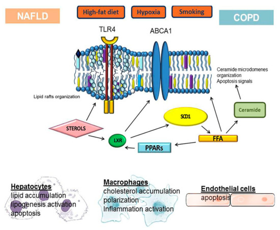 Nuclear receptors play a prominent role in the pathogenesis of both diseases. It is known that the activation of nuclear receptors plays a prominent role in the pathogenesis of both diseases, the LXRs’ family being of particular importance among them. Activation of this nuclear receptor induces ABCA1-mediated elimination of excess cholesterol from cells and reduces lipotoxicity by increasing SCD1 activity and reducing the concentration of saturated fatty acids in cells. Additionally, LXR-mediated processes stimulate M2 anti-inflammatory differentiation of macrophages in the liver and lungs. Thus, LXR activation in cells may have a protective effect aimed at reducing the intensity of inflammation and, in both cases, can serve as a marker of cellular lipid overload. Nevertheless, in spite of the general protective role, hyperexpression of LXR in the liver is accompanied by excessive accumulation of lipids in the liver, through stimulation of lipogenesis de novo by the mechanism of activation of SREBPs and ChREBP family proteins, which makes the role of this cellular receptor in the pathogenesis of NAFLD ambiguous. Meanwhile, in lung macrophages of COPD patients, cholesterol accumulation associated with decreased expression and functional activity of ABCA1 may be associated with inflammation.