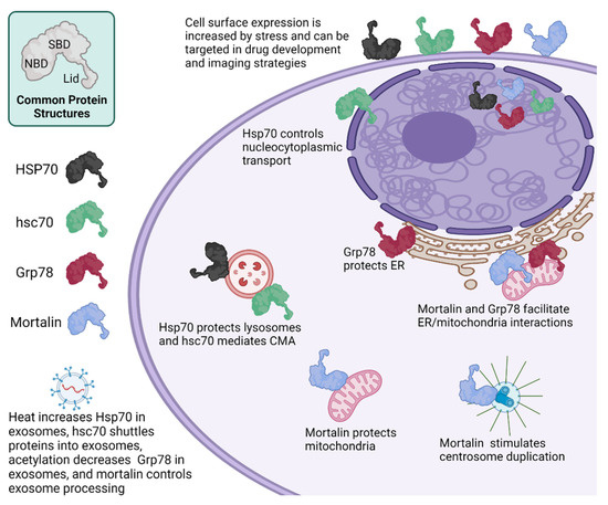 Rai, R.; Kennedy, A.L.; Isingizwe, Z.R.; Javadian, P.; Benbrook, D.M. Similarities and Differences of Hsp70, hsc70, Grp78 and Mortalin as Cancer Biomarkers and Drug Targets. Cells 2021, 10, 2996. https://doi.org/10.3390/cells10112996
