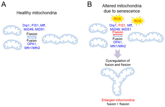Schematic representation of basic mechanisms of senescence-induced mitochondrial damage. (A) Mitochondria are organelles that undergo a continuous cycle of fusion and division. The proteins involved in mitochondrial fusion include mitofusin 1 (Mfn1), mitofusin 2 (Mfn2), and mitochondrial dynamin-like GTPase (OPA1). Proteins involved in mitochondrial fission include fission 1 protein (FIS1), mitochondrial fission factor (Mff), mitochondrial dynamics proteins of 49 kDa and 51 kDa (MiD49 and MiD51, respectively), and dynamin-related protein 1 (Drp1). (B) As senescence progresses, dysfunctional mitochondria are not efficiently eliminated and constitute a major cause of excessive ROS production. Increased oxidative damage by senescence depletes FIS1 and disrupts the mitochondrial fusion/fission balance, resulting in the formation of enlarged mitochondria. ROS: reactive oxygen species.