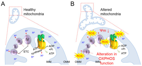 Mitochondria generate the chemical energy needed to power biochemical reactions in the form of ATP, and the amount of ATP accounts for about 90% of ATP production in the cell [58]. ATP production in mitochondria is accomplished by a sequential reaction called OXPHOS, which involves four ETC complexes (complexes I through IV) and ATP synthase [59]. During OXPHOS, the redox process of the ETC produces a hydrogen ion (H+) concentration gradient, leading to the movement of H+ from ATP synthase to the matrix to generate ATP (Figure 2A).