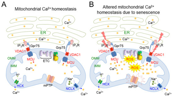 Schematic representation of the basic mechanisms of mitochondrial Ca2+ homeostasis. (A) Mitochondrial Ca2+ homeostasis is regulated by protein channels localized in the mitochondrial inner membrane (IMM) and mitochondrial outer membrane (OMM), and also by crosstalk with the ER. ER: endoplasmic reticulum; IP3R: inositol 1,4,5-trisphosphate receptor; VDAC: voltage-dependent anion channels; MCU: mitochondrial calcium uniporter; HCX: H+/Ca2+ exchanger; NCLX: Na+/Ca2+ exchanger; mPTP: mitochondrial transition pore. (B) Senescence triggers IP3R to release Ca2+ from the ER and causes VDAC/MCU channels to initiate the inward flow of Ca2+, leading to mitochondrial Ca2+ overload. Mitochondria overloaded with Ca2+ cause the collapse of the electron transfer in the ETC, resulting in increased electron leak and consequent mitochondrial ROS generation. An increase in mitochondrial ROS due to mitochondrial Ca2+ overload induces the sustained opening of the mitochondrial transition pore (mPTP). The lightning bolt indicates stress caused by senescence.