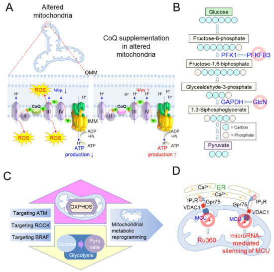Targeting mitochondrial metabolism as a strategy to treat senescence. (A) Senescent cells exhibit a deficiency in coenzyme Q10 (CoQ), which accepts electrons from complex I/II and transfers them to complex III in the ETC (green CoQ indicates a deficiency in CoQ). Electrons that leaked from the ETC prematurely react with O2, causing excessive mitochondrial ROS production. A deficiency of CoQ reduces the efficiency of OXPHOS based on ΔΨm in flowing protons back to the mitochondrial matrix via ATP synthase, resulting in decreased ATP production. CoQ supplementation improves OXPHOS efficiency, which manifests as a significant increase in ATP production and a significant decrease in mitochondrial ROS generation (pink CoQ indicates a higher level of CoQ in the IMM). (B) PFKFB3 is a gene that encodes 6-phosphofructo-2-kinase/fructose-2,6-biphosphatase 3, which activates phosphofructokinase 1 (PFK1), converting fructose-6-phosphate to fructose-1,6-bisphophate. Pharmacological inhibition of the glycolytic activator, PFKFB3, inhibits glycolysis and prevents the senescence-associated secretory phenotype (SASP)-mediated spread of senescence in endothelial cells (ECs). D-glucosamine (GlcN) inhibits the activity of glyceraldehyde-3-phosphate-dehydrogenase (GAPDH) in the glycolytic pathway. GlcN increases mitochondrial respiration by promoting the dependence of energy metabolism on OXPHOS while impairing glycolysis. (C) The strategy of targeting pathways directly or indirectly linked to mitochondrial metabolism. ATM: ataxia telangiectasia mutated; ROCK: rho-associated protein kinase; BRAF: serine/threonine protein kinase B-Raf. (D) The strategy of maintaining mitochondrial metabolism through mitochondrial Ca2+ homeostasis. The cell-permeable MCU inhibitor, Ruthenium 360 (Ru360), maintains mitochondrial Ca2+ at basal levels and improves OXPHOS efficiency. The inhibition of MCU by microRNA-mediated silencing also protects cardiomyocytes from oxidative damage and restores mitochondrial function restoration.