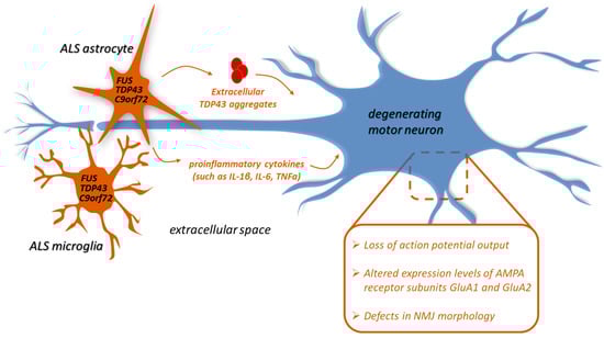 Non-cell-autonomous mechanisms underlying motor neuron degeneration mediated by ALS-linked C9orf72, FUS, or TDP-43 astrocytes and microglia. Wild-type motor neurons undergo cell death when co-cultured with astrocytes or microglia expressing ALS-linked C9orf72, FUS, or TDP-43. Mechanisms underlying non-cell-autonomous toxicity include loss of action potential output, altered expression levels of AMPA receptor subunits GluA1 and GluA2, and defects in neuromuscular junction (NMJ) morphology. These effects could be mediated by the extracellular secretion from glial cells of proinflammatory cytokines, such as IL-1β, IL-6, and TNFa, or TDP-43 aggregates.