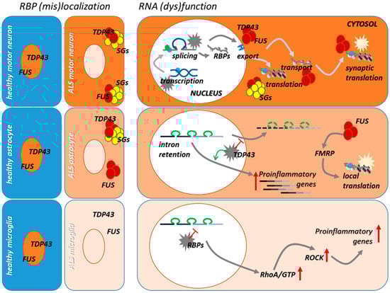 Features of RBP/RNA dysfunction in FUS and TDP-43 motor neurons, astrocytes, and microglia. FUS and TDP-43 are localized in the nucleus of normal cells, where they control several aspects of nuclear mRNA metabolism, including mRNA transcription and splicing. They also localize in the cytoplasm of cells where they participate in the control of mRNA transport and translation. In ALS motor neurons, FUS and TDP-43 massively delocalize in the cytoplasm, where they form cytoplasmic aggregates which frequently colocalize with stress granules (SGs). In these conditions, both gain of cytoplasmic toxic functions and loss of nuclear function contribute to the pathological mechanisms underlying motor neuron degeneration. In activated astrocytes and microglia, which are deeply involved in the progressive demise of motor neurons in ALS, cytoplasmic mislocalization of FUS and TDP-43 also occurs. In astrocytes, this leads to decreased intron retention in transcripts that regulate their reactive state, which eventually leads to an increase in their expression. Further, cytoplasmic ALS RBPs might interfere with the activity of FMRP causing alterations in local translation, which also occur in astrocyte distal processes. Dysregulation in the alternative splicing of proinflammatory transcripts also occurs in RBP-defective microglia thus supporting a role of these mechanisms in microglia activation in ALS.