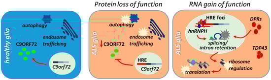 Reduced C9orf72 transcript and protein levels have been confirmed in different brain areas of post-mortem tissues of C9orf72-ALS patients (recently reviewed in []), but it is still unclear whether this also occurs specifically in microglia and astrocytes. However, it has been reported that in mice, the loss of C9orf72 protein induces the upregulation of proinflammatory cytokines, altered immune responses, and lysosome accumulation in microglia, thus potentially leading to defects in the ability to remove aggregated proteins []. Similarly, C9orf72 knockdown in U87 glioblastoma cells or normal human astrocytes induces the formation of p62 inclusions [], a pathological feature of C9orf72-ALS []. Further, these cells show altered expression of thousands of genes, including genes involved in the immune system and glutamate-associated pathways, leading to defects in glutamate metabolism [].