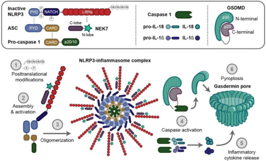 In order to be activated, the NLRP3 inflammasome requires a complex association of specific proteins (Figure 1). The first interaction occurs between NLRP3 and the apoptosis associated speck-like protein containing a C-terminal caspase recruitment domain (ASC). ASC is a cytosolic protein composed of a C-terminal caspase recruitment domain (CARD) and a PYD. This protein plays a central role in the inflammasome complex activation by acting as a bridge between NLRP3 proteins and pro-caspase-1 [4,5]. The interaction of NEK7 with the LRR domain of NLRP3 is also needed to complete inflammasome activation [6]. NEK7 is a member of the NIMA (“never in mitosis gene a”) related serine-threonine kinase family, composed of a catalytic domain with a 30–40 amino acid N-terminal extension [7]. Importantly, in its absence, interleukin-1β (IL-1β) release and the conversion of pro-caspase-1 into its active form, caspase-1, are suppressed [6].