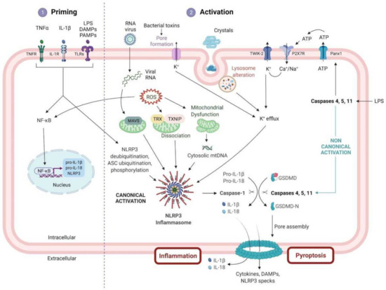 Lysosomal alterations [49,50] and mitochondrial reactive oxygen species (ROS) generation [51,52] also promote the complex assembly. More specifically, ROS trigger the activation of NLRP3 in different ways. Firstly, ROS induce a dissociation of thioredoxin interacting protein (TXNIP) and thioredoxin (TRX), which leads to an interaction between TXNIP and NLRP3 [53]. Secondly, ROS cause the release of mitochondrial DNA into the cytosol, ultimately causing NLRP3 inflammasome activation. In addition, ROS lead to NF-κB activity, thereby increasing NLRP3 priming and activation [54].