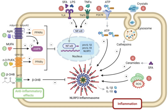 NLRP3 may be a sensor for metabolic “danger” signals, which may either serve as priming signals that induce NLRP3 and pro-IL-1β transcription or as second phase signals triggering inflammasome formation [91,92] (Figure 4).