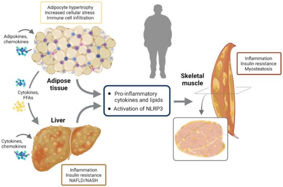 Most of the first and second phase signals that enhance NLRP3 responses may either activate the transcription of inflammatory genes via NF-κB or inhibit key components of the insulin-signaling cascade through inactivating phosphorylation, thereby promoting insulin resistance [89,98]. In obesity, adipocyte hypertrophy induces cellular stress together with immune cell infiltration, the release of inflammatory adipokines and insulin resistance. Once adipose tissue storage capacity is overwhelmed, ectopic lipid deposit occurs in several tissues, including the liver and skeletal muscle, further worsening inflammation and insulin resistance [94]. This leads to NAFLD/NASH in the liver and to myosteatosis in skeletal muscle. NLRP3 plays a crucial role in metainflammation and in the interplay between these three insulin target tissues (Figure 5).