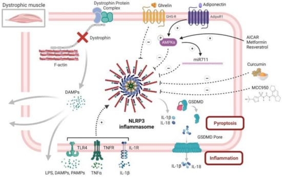 DMD is the most frequently inherited human myopathy and the most devastating type of muscular dystrophy. DMD is caused by mutations in the gene encoding for dystrophin, a key scaffolding protein, which forms an important protein complex that connects the actin cytoskeleton of myofibers to the extracellular matrix (Figure 5). This complex is crucial for maintaining cell membrane stability and permeability, as well as normal contractile function of the skeletal muscle. Absence of dystrophin leads to the disruption of this complex and, thus, to membrane damage, allowing for DAMP release, chronic inflammation and severe muscle degeneration. DMD remains a lethal muscle disorder with no cure, where the first signs of muscle weakness begin early on in life and, without proper intervention, death typically occurring in the 20s and 30s [82,138]. Our group has shown that NLRP3 and IL-1β were highly expressed, not only in C2C12 murine cell lines challenged by inflammation but, also, in human primary cultured myotubes derived from DMD patients. Likewise, all inflammasome components were upregulated in the skeletal muscles of mdx mice (a mouse model of Duchenne), and the complex was overactivated [80]. Specific NLRP3 depletion in mdx mice markedly protected the skeletal muscle against inflammation, oxidative stress and injury, while increasing its force and endurance, thus helping to rescue the dystrophic phenotype [80,82]. Moreover, we discovered that adiponectin, a pleiotropic adipokine with potent anti-inflammatory effects, could significantly downregulate the NLRP3 inflammasome [80]. Briefly, adiponectin binds to its muscle specific receptor, AdipoR1, and activates the AMPK pathway, which, in turn, represses the NLRP3 inflammasome, in part through reduction of NF-κB activity and oxidative stress [82,138]. In addition, activating AMPK leads to an upregulation of the adiponectin muscle anti-inflammatory mediator, miR-711. We found that adiponectin, through miR-711, could be a major repressor of the NLRP3 inflammasome by inhibiting both its priming and activation in muscle [80,82]. This repression occurred both in vitro, in C2C12 myotubes, and in vivo after either local or systemic adiponectin supplementation [80,139] (Figure 6). In agreement with our data, other drugs and molecules that mainly activate AMPK signaling, such as AICAR (analog of adenosine monophosphate), resveratrol, a natural polyphenolic compound, and metformin (used for treating type 2 diabetes) were also found to mitigate some features of DMD in cell cultures and in animal models [140,141,142,143]. Metformin was also tested in a randomized, double-blind, placebo-controlled Phase III clinical trial in combination with L-citrulline, as a possible treatment for DMD. The study is completed and it showed only a small reduction in motor function decline among the stable subgroup of patients treated with this combination therapy (ClinicalTrials.gov Identifier: NCT01995032, accessed on 2 November 2021). A big part of their beneficial effects is mediated through the reduction in inflammation and in the inflammasome [112,138]. Similar to adiponectin, the gastric peptide ghrelin, famously known as the “hunger hormone”, is another circulating hormone with an anti-inflammatory effect [144]. Once injected in mdx mice, ghrelin was found to improve muscle performance and alleviate muscle pathology through the inhibition of NLRP3 inflammasome activation and subsequent maturation of IL-1β [135]. In addition, the plant compound, curcumin, a NF-κB inhibitor, also showed beneficial effects on the dystrophic skeletal muscle by reducing the levels of TNFα and Il-1β and improving cell membrane integrity, once injected in mdx mice [145] (Figure 6).