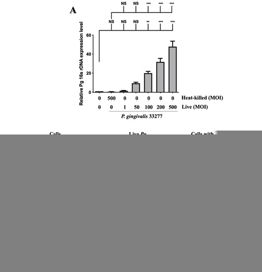 Porphyromonas gingivalis (P. gingivalis; ATCC® 33277™; ATCC; Manassas, VA, USA) was cultured under an anaerobic condition in 37 °C incubator using CDC ANA agar 5% sheep blood (Dr.plate, Taipei, Taiwan) and tryptic soy broth (TSB; Cat. # 7164A; Acumedia, Lansing, MI, USA). Heat-killed and live P. gingivalis were freshly prepared for each experiment. Briefly, P. gingivalis was centrifuged, washed with phosphate buffer saline (PBS) and dispersed in serum- and antibiotic-free cell culture medium. P. gingivalis was applied directly to the cells for live condition while it was treated with heat at 80 °C for 10 min [50] for heat-killed condition.