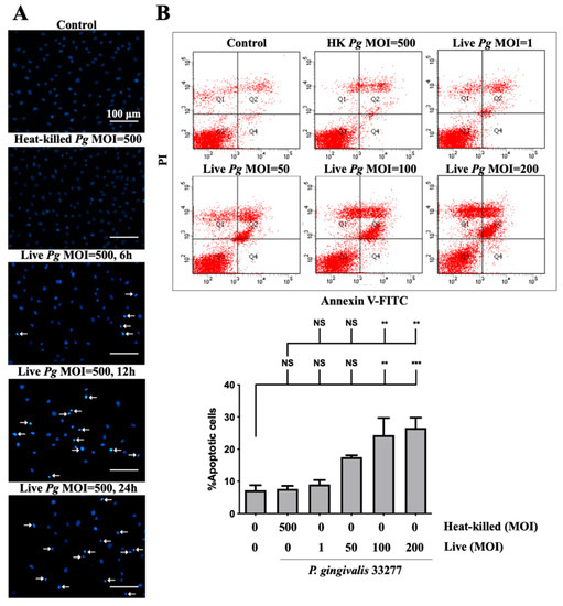 Previous studies reported on the induction of cell apoptosis by infection with P. gingivalis in human aortic endothelial cells [13] and gingival epithelial cells [58]. Thus, we determined whether P. gingivalis infection caused apoptosis in brain endothelial cells. As shown in Figure 3A, a significant number of condensed nuclei were observed after P. gingivalis infection, which was initiated at 90 min and reached a peak at 12 h and was sustained for 24 h. No condensed nucleus was observed in cells infected by heat-killed bacteria (Figure 3A). We further performed the staining of annexin V and propidium iodide (PI) to determine apoptotic cells following treatment with P. gingivalis in endothelial cells. Cells infected with low MOI P. gingivalis (50 MOI) slightly induced apoptosis (Figure 3B). Importantly, the number of apoptotic cells was significantly elevated after infection with MOI (100 and 200 MOI). However, the number of apoptotic cells was not observed in either heat-killed or live P. gingivalis at an MOI of 1 (Figure 3B). These results indicate that infection with P. gingivalis causes cell death by inducing apoptosis in brain endothelial cells.