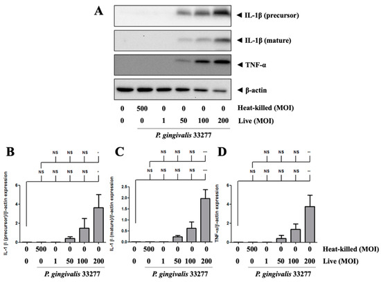 P. gingivalis up-regulated IL-1β and TNF-α protein levels in bEnd.3 cells. (A) Cells are infected with live (MOI 1, 50, 100 and 200) or heat-killed (MOI 500) P. gingivalis for 90-min followed by 24-h fresh medium incubation. Protein expressions of IL-1β (precursor), IL-1β (mature), TNF-α, and β-actin are determined using Western blot analysis. The quantitative results were shown in bar graph (B–D). Data are presented as mean values ± SEM (n = 3). Significance differences of the control or heat-killed P. gingivalis group are expressed as *, p < 0.05; **, p < 0.01; ***, p < 0.001 and NS, p > 0.05.