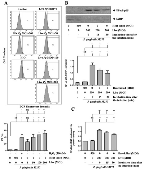 Next, to investigate whether ROS production is involved in P. gingivalis-induced endothelial cell death, the intracellular ROS level was determined after P. gingivalis infection. As shown in Figure 5A, P. gingivalis enhanced ROS production by approximately 15-to 25-fold in infected brain endothelial cells. We have previously reported that activation of NF-κB is a critical modulator of the up-regulation of inflammatory cytokines [59,60,61]. As shown in Figure 5B, P. gingivalis induced a significant translocation of NF-κB p65 protein to the nucleus. After 90 min of P. gingivalis infection, the nuclear NF-κB p65 protein increased immediately and was sustained for 30 min. In addition, the NF-κB p65 DNA-binding activity increased approximately 2.1-fold immediately and was sustained for 30 min after P. gingivalis exposure (Figure 5C). In addition, heat-killed bacteria did not affect ROS production or activation of NF-κB p65. Our results indicate that P. gingivalis infection increases ROS production and NF-κB activation in brain endothelial cells.