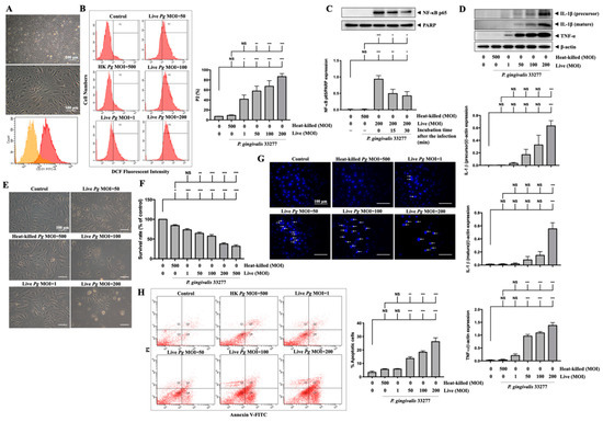 P. gingivalis up-regulates ROS and NF-κB activation and increases the expression of inflammatory cytokines and cell death in primary mouse brain endothelial cells (MBECs). Cells are obtained from 6–7 weeks of adult C57BL/6 mice. The morphology of MBECs at passage 1 is observed with a light microscope ((A), upper panel). The expression of platelet endothelial cell adhesion molecule 1 (PECAM-1/CD31) is examined by flow cytometry and presented as histograms ((A), lower panel). (B) MBECs are infected with various MOI (1, 50, 100 and 200) of P. gingivalis for 90 min. The intracellular ROS is determined by DCF fluorescence intensity using flow cytometry shown as gated histogram (B). Followed by 24 h of incubation, the expression of IL-1β (precursor), IL-1β (mature), TNF-α, and β-actin proteins are determined by Western blot analysis. Quantitative results are presented as bar graphs in low panels (D). Cell morphology is observed under a light microscope (E). Condensed nuclei are determined by DAPI staining and viewed with a fluorescence microscope. Arrows indicated condensed nuclei (G). Annexin V/PI staining is performed to determine apoptotic cells and analyzed by a flow cytometer (H). (C) Cells are infected with P. gingivalis for 90-min and incubated with fresh medium for the indicated time periods (15 and 30 min), nuclear NF-κB p65 translocation is determined by Western blot analysis. (F) MBECs are infected with various MOI (1, 50, 100, 200 and 500) of P. gingivalis for 90 min. The cell viability is determined by MTT assay (as a percentage of control) after 24 h of incubation. Data are presented as mean values ± SEM (n = 4). Significant differences of the control group and heat-killed P. gingivalis groups are expressed as *, p < 0.05; **, p < 0.01; ***, p < 0.001; NS, p > 0.05. Scale bars are 200 and 100 μm in (A) and 100 μm in (E,G).