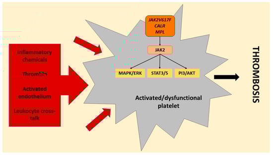 - Marin Oyarzún, C.P.; Heller, P.G. Platelets as mediators of thromboinflammation in chronic myeloproliferative neoplasms. Front. Immunol. 2019, 10, 1373. [Google Scholar] [CrossRef] [PubMed] [Green Version]