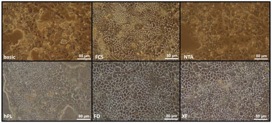 The morphology of the cells was assessed during growth with different media supplements using phase contrast microscopy. Figure 1 shows representative images 7 days after seeding the cells. Cells cultured with the synthetic supplements (basic and NTA) appeared less vital and proliferated more slowly compared with those in FCS. Additionally, they never became confluent and showed signs of senescence. Thus, we did not conduct further analyses with these conditions.