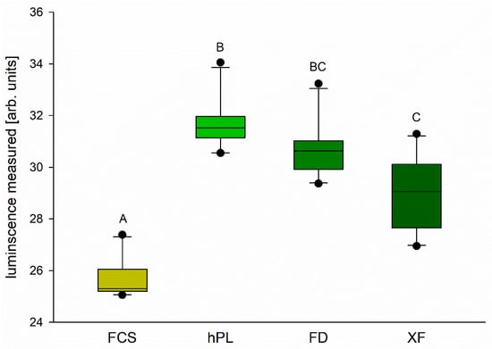 Cell viability was assessed using a Cell Titer Glo® Luminescent Cell Viability Assay. Boxes represent medians ±10th, 25th, 75th and 90th percentile. Outliers are represented by dots; n = 10, one-way RM ANOVA + Holm–Sidak test, p < 0.01. Different letters (A, B, C) indicate significant differences between groups.
