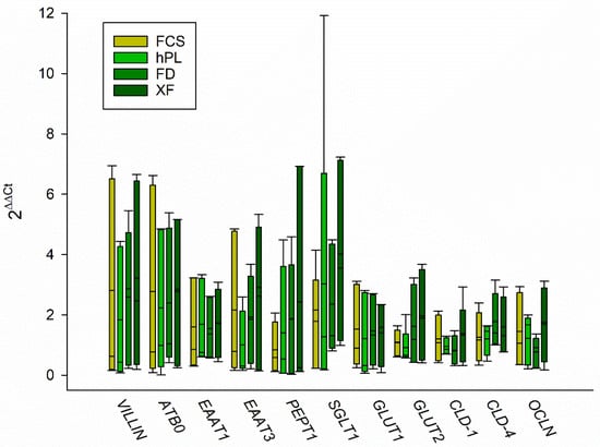 In order to evaluate the grade of differentiation of the cells with different media supplements, we measured the gene expression of markers for differentiated enterocytes using RT-qPCR. As a major function of a differentiated enterocyte is the vectorial transport of nutrients, we assessed the expression of the amino acid transporter B0 (ATB0), excitatory amino acid transporter (EAAT) 1 and 3 and peptide transporter (PEPT) 1 as well as the glucose transport proteins sodium linked glucose transporter (SGLT) 1 and glucose transporter (GLUT) 1 and 2. Similarly important is the ability to form a barrier, which is why we also assessed the expression of the tight junction proteins claudin (CLD) 1 and 4 as well as occluding (OCLN). Additionally, the brush border membrane protein VILLIN was chosen. In all PL supplements, all genes investigated were expressed in a similar range and there was no significant difference to those cultured with FCS (Figure 3).