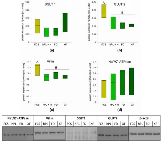 Protein expression of SGLT1 (a), GLUT2 (b), v (c) and Na+/K+-ATPase (d) was assessed by Western blot analysis in order to evaluate differentiation of the cells after growth with the different supplements. Boxes represent medians ±10th, 25th, 75th and 90th percentile; N = 3, one-way RM ANOVA + Holm–Sidak test, p < 0.05. Different letters (A, B) indicate significant differences between groups. Representative blots are shown below. GLUT: glucose transporter, SGLT1: Na+-coupled glucose transporter 1.