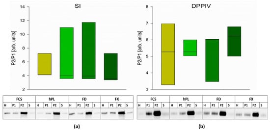 To further examine the correct sorting or trafficking of brush border membrane proteins, we prepared BBM and measured the protein expression of dipeptidyl-peptidase IV (DPPIV) and sucrase–isomaltase (SI). As shown in Figure 5, the sorting of SI (Figure 5a) or DPPIV (Figure 5b) within the groups cultured with the different media supplements was similar to the group cultured with FCS.