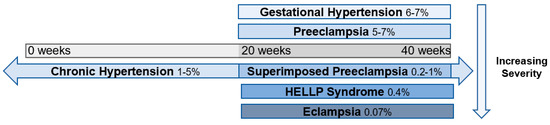 Figure 1. Spectrum of hypertensive disorders during pregnancy and their prevalence [9,10,11]. Gestational hypertension is defined by new-onset elevations in blood pressure (<140/90 mmHg) after 20 weeks of gestation, whereas preeclampsia is also accompanied by proteinuria and end-organ dysfunction. Chronic hypertension is present prior to 20 weeks of gestation or continues >12 weeks into the postnatal period and can occur in concert with preeclampsia. Hemolysis, elevated liver enzymes, and low platelets (HELLP) syndrome is classified as a subset of preeclampsia, and eclampsia is a complication of preeclampsia characterized by the addition of seizures.