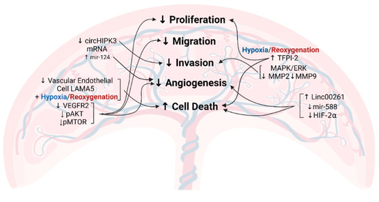 Figure 2. Identified and proposed mechanisms for abnormal placental development in preeclampsia [49,50,51,52,53,54,55,56,57,58,59] (circHIPK3, circular RNA homeodomain interacting protein kinase 3; LAMA5, laminin subunit alpha-5; VEGFR2, vascular endothelial growth factor receptor 2; pAKT, phosphorylated protein kinase B; pMTOR, phosphorylated mammalian target of rapamycin; TFPI-2, tissue factor pathway inhibitor-2; MAPK, mitogen-activated protein kinase; ERK, extracellular-signal-regulated kinase; MMP, matrix metalloproteinase; HIF-2α, hypoxia-induced factor-2α; ↑ refers to upregulation; ↓ refers to downregulation).
