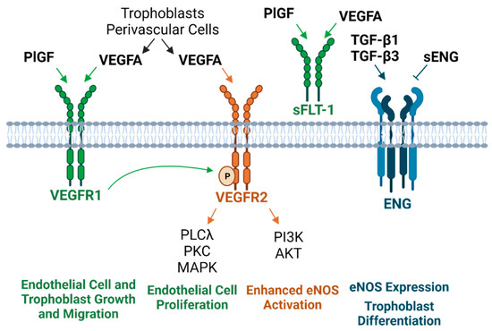 Preeclampsia is characterized by an imbalance of pro- and antiangiogenic factors, which directly impacts endothelial function [97,98,99,100]. VEGFA stimulates angiogenesis, vascular permeability, and cell migration by binding to its tyrosine kinase receptors VEGFR1 and VEGFR2 [101,102]. VEGFA binding to VEGFR2 elicits stronger signaling than VEGFR1 [103] via activation of the phospholipase C gamma (PLCy)/protein kinase C (PKC)/MAPK pathway involved in endothelial cell proliferation [101]. During placental villous development, VEGFA is present in trophoblasts and perivascular cells to support de novo vascular development (i.e., vasculogenesis), as well as vessel expansion via endothelial sprouting (i.e., angiogenesis) [104]. In pregnancy, VEGF induces a more robust activation of endothelial nitric oxide synthase (eNOS), with NO production primarily occurring through VEGFR2-induced PI3K/AKT signaling [105,106]. PlGF, its proangiogenic counterpart, binds to VEGFR1 to increase the likelihood of VEGF binding to VEGFR-2 [107]. PlGF’s interaction with VEGFR1 also promotes other critical events, such as transphosphorylation of VEGFR2, augmenting its downstream signaling cascade [107]. Similar to VEGF, the actions of PlGF facilitate the growth and migration of endothelial and trophoblast cells [107,108,109]. In healthy pregnancies, PlGF increases until 32 weeks and then subsequently declines [110,111]. However, in preeclampsia, there is a marked reduction in venous levels as early as 13–16 weeks, occurring before the onset of other clinical symptoms [108,112]. Not only does this have adverse cardiovascular consequences during pregnancy, but these vascular pathologies and unfavorable cardiac remodeling can persist for years beyond pregnancy [113]. This suggests that though overt symptoms are often resolved after delivery, preeclamptic mothers are at risk for cardiovascular disease years or decades later.