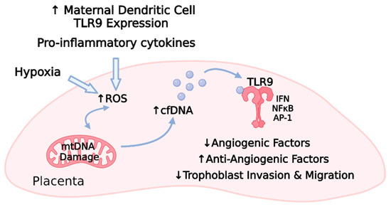 Figure 5. Maternal factors, including TLR9-induced proinflammatory cytokine release and placental hypoxia, promote a cascade of oxidative stress, mitochondrial DNA damage, cell-free DNA release, TLR9 activation, and subsequent TLR9 activation within the placenta [83,244,245,246,247,248,249,250,251,252,254,255]. Animal and cell culture models indicate that TLR9-related signaling results in decreased angiogenic factors, increased antiangiogenic factors, and impaired trophoblast function [83] (TLR9, toll-like receptor 9; ROS, reactive oxygen species; mtDNA, mitochondrial DNA; cfDNA, cell-free DNA; IFN, interferon; NFκB, nuclear factor kappa B; AP-1, activator protein-1; ↑ refers to upregulation; ↓ refers to downregulation).