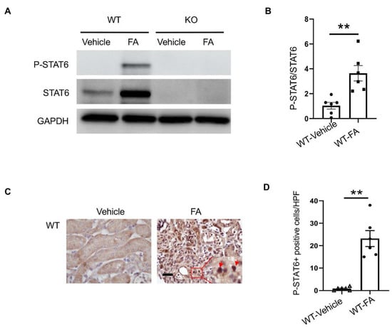 To examine if STAT6 is activated in the kidney with folic-acid-induced nephropathy, wild-type and STAT6 KO mice were administered vehicle or folic acid. The kidneys were harvested two weeks after administration. Immunoblotting analysis indicated that STAT6 phosphorylation was significantly induced in the kidney following folic acid administration (Figure 1A). Of note, both STAT6 and phospho-STAT6 were not detected in the kidneys of STAT6 KO mice, confirming STAT6 deletion. To determine the types of cells that are responsible for STAT6 activation, kidney sections were immunostained for STAT6 phosphorylation. Phospho-STAT6-positive staining was mainly detected in kidney interstitial cells after folic acid administration (Figure 1B), indicating that STAT6 activation occurs during renal fibrosis development in folic acid nephropathy.