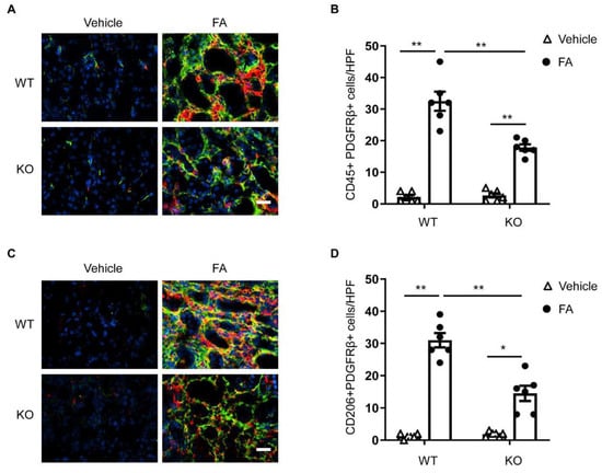 We then examined whether STAT6 plays a role in myeloid fibroblast accumulation in the kidney with folic acid nephropathy. Kidney sections were immunostained for the leukocyte marker, CD45, and the mesenchymal marker, PDGFR-β. Compared with vehicle-treated mice, mice treated with folic acid accumulated higher amounts of PDGFR-β and CD45 dual-positive cells. The number of PDGFR-β and CD45 dual-positive cells was significantly diminished in the kidneys of STAT6 KO mice with FA treatment (Figure 2A,B). These results demonstrate that STAT6 deficiency attenuates myeloid fibroblast activation in the kidneys of mice treated with FA.