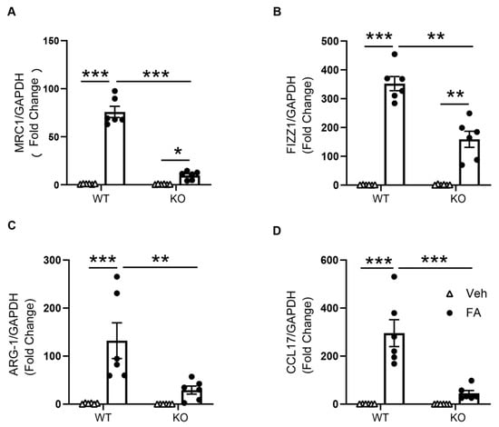 The mRNA expressions of M2 macrophage markers were then assessed to further determine the role of STAT6 on M2 macrophage polarization. The mRNA gene expression levels of Arg-1, CCL17, Fizz1, and MRC1 were considerably increased in the kidneys of folic-acid-treated WT mice compared with vehicle-treated WT mice. STAT6 deficiency significantly attenuated the mRNA gene expression levels of Arg-1, CCL17, FIZZ1, and MRC1 in the kidneys with folic acid nephropathy (Figure 3). These results demonstrate that STAT6 signaling drives macrophage polarization to the profibrotic M2 phenotype.