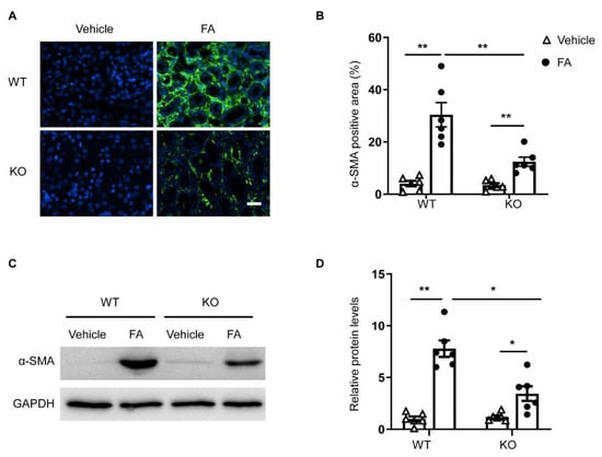 To determine whether the deletion of STAT6 affects myofibroblast transformation, kidney sections were immunostained for a myofibroblast marker, α-smooth muscle actin (α-SMA). A greater number of α-SMA positively stained cells was observed in the kidneys of WT mice treated with folic acid. In contrast, genetic deletion of STAT6 significantly diminished the number of α-SMA-positive cells in the kidney following FA treatment (Figure 4A,B). Moreover, the immunoblotting analysis revealed that α-SMA protein level was markedly lower in the kidneys of STAT6 KO mice following folic acid administration compared with folic-acid-treated WT mice (Figure 4C,D). These results indicate that the genetic disruption of STAT6 prevents myofibroblast transformation in folic acid nephropathy.