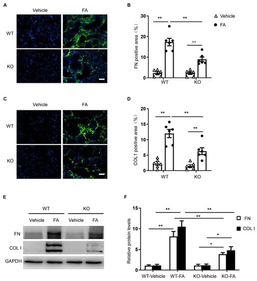 STAT6 deficiency attenuates the expression of ECM proteins in folic acid nephropathy. (A) Representative photomicrographs of kidney sections immunostained for fibronectin (green) and counterstained with DAPI (blue). Scale bar, 50 μm. (B) Quantitative analysis of the fibronectin-positive area in kidneys. ** p < 0.01. n = 6 per group. (C) Representative photomicrographs of kidney sections immunostained for collagen I (green) and counterstained with DAPI (blue). Scale bar, 50 μm. (D) Quantitative analysis of collagen-positive area in kidneys. ** p < 0.01. n = 6 per group. (E) Representative Western blots show protein expression of collagen I and fibronectin in the kidneys. (F) Quantitative analysis of protein levels of collagen I and fibronectin in the kidneys. ** p < 0.01; * p < 0.05. n = 6 per group.